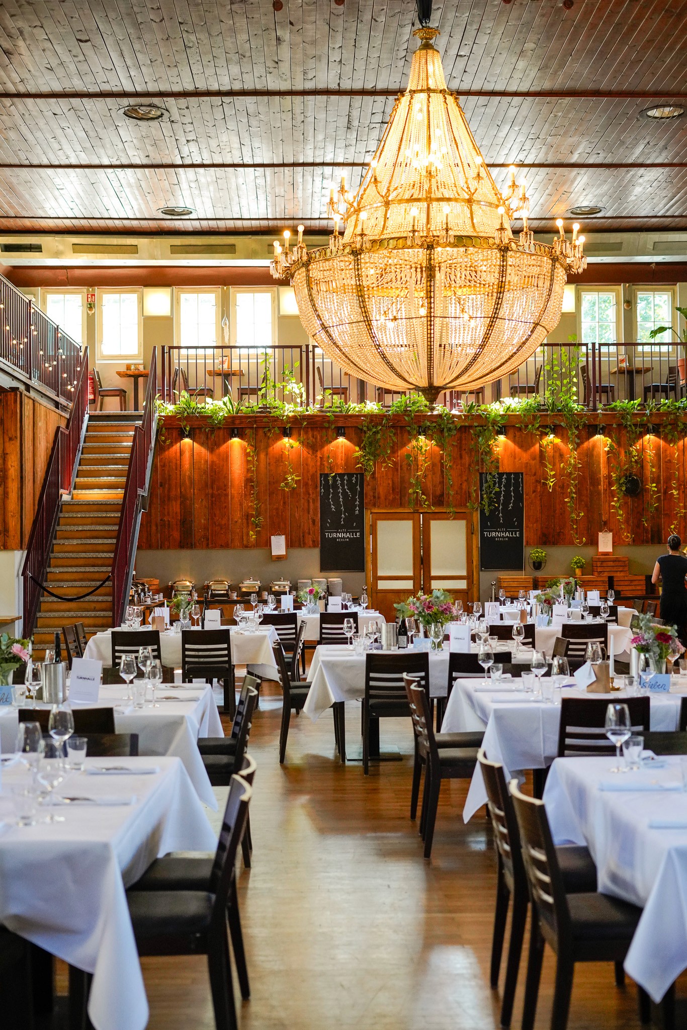 The protected hall area from 1954 still features the original parquet flooring and ladder rungs from the former school gymnasium. Without columns, surrounded by a gallery, with a ceiling height of almost 7 meters and an event space of nearly 280m², the hall offers exclusive opportunities for up to 300 people.