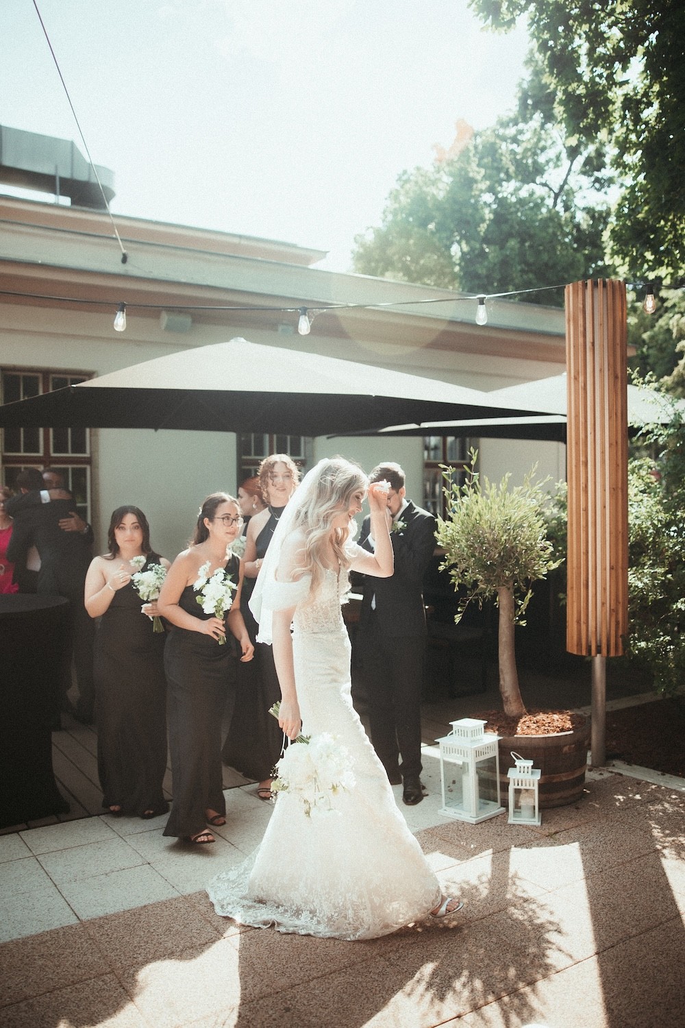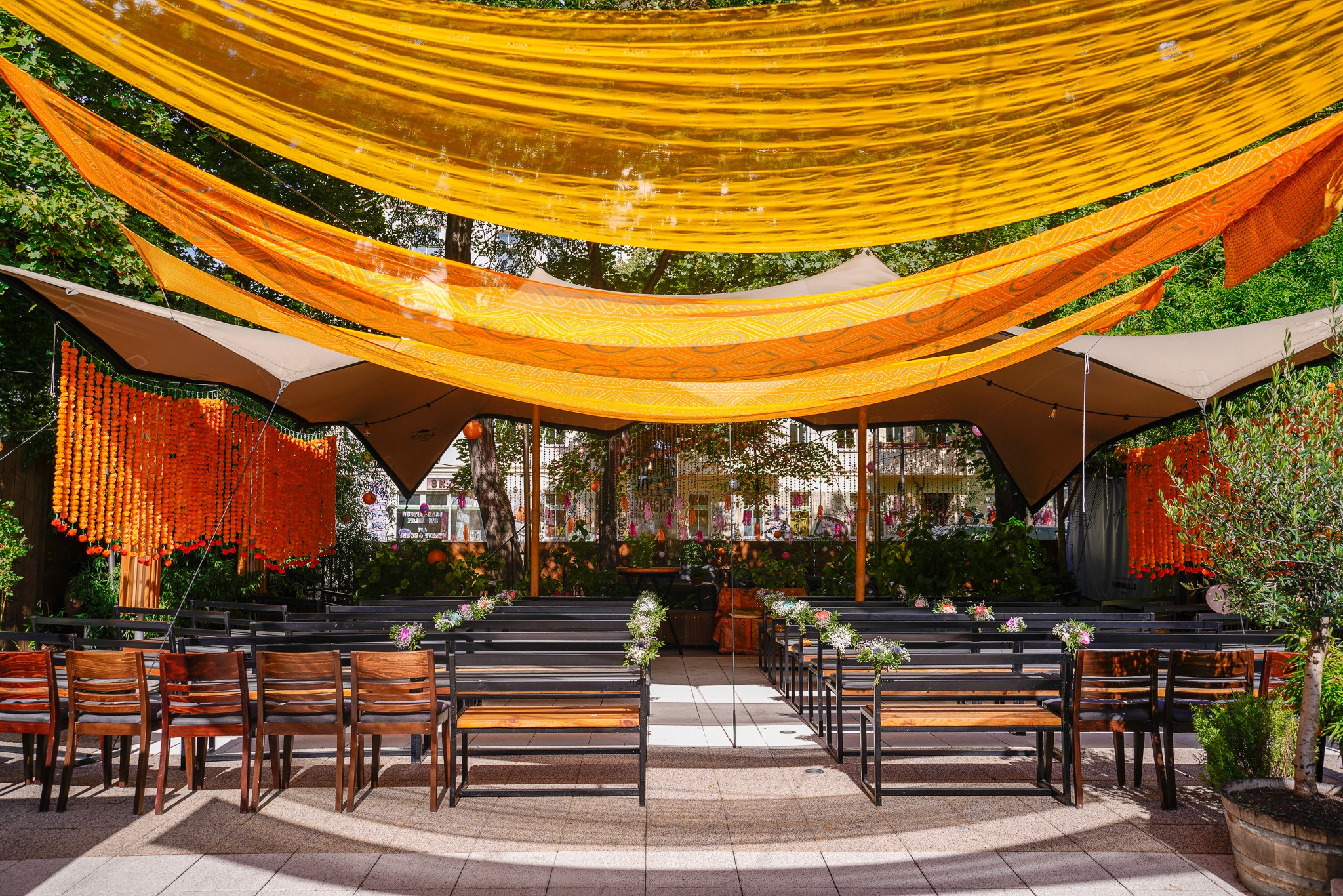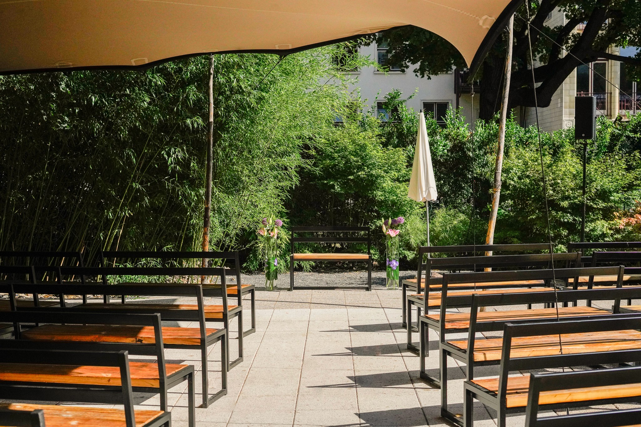 In the quiet outdoor area, different moods arise between rose bushes, natural stone fountains, sand, and wooden floors. The view of the column-adorned, protected gymnasium building between the outdoor bar and cast iron fence creates a very special atmosphere.