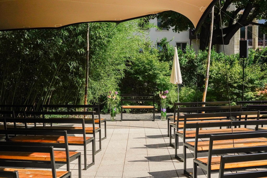 Der Sommergarten der Alte Turnhalle Berlin bietet einen besonderen Ort für freie Trauungen unter freiem Himmel – mitten in Berlin und dennoch angenehm abgeschirmt vom Trubel der Stadt. Umgeben von Grün entsteht eine intime, entspannte Atmosphäre, in der der Moment ganz Ihnen gehört.